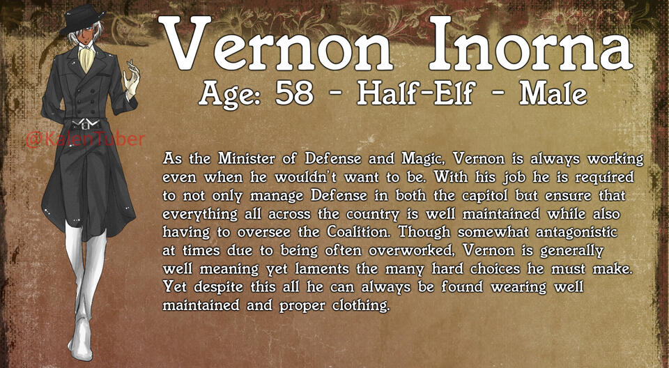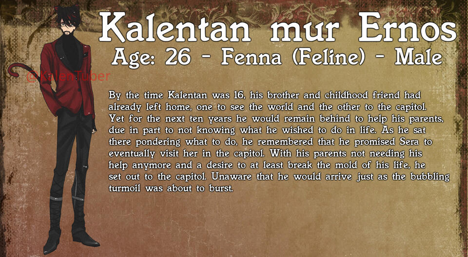 The world from which Kalentan hails from is known as Kosare. Specifically from a time period which would eventually be given the name, The 2nd Age of Heroes, for the events here more than any other time in the worlds history would define it's future.It is a world of mortals, magic, gods, and all other matter of creature.Like most worlds, Kosare has known it's fair share of conflicts, those from the planet itself and even celestial from beyond.Though the world was far more united in ages past, it has never been more divided. In a simplified fashion, the world can be looked at in two states, before the Seven Sinners and after.For it was the killing of the Goddess of War Jahura at the hands of mortals, comprised of Humans, Elves, Tenna and Fenna. This moment would lead to the removal of their native magic from those races, forcing them be gifted by Spirits to get even a fraction of it back. Most of all the once megacontinent was split into three.The four races were relocated to the northern continent. While the myraid other races, those that did not bring their sword to the gods and still faithful were relocated to Ishkara, the southern continent. And other manner of ungodly beings were sent to the Old World continent.It has been thousands of years since this event occurred. Wars have begun and ended, a new pantheon of Gods were born in the northern continent and almost waged war against the original gods. Mortals themselves still contest with one another, and other powerful beings still seek to make their own claims to the world.There is still much more to this story, hidden truths of the past, and a unknown future.