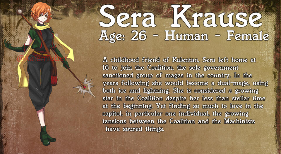 “It’s all of it,” she admitted but then elaborated. “But you know that whole thing with Laura.”Kalentan held a palm up to his face. “Oh, dumb of me to forget. I forgot she had said no…”Sera looked down at the ground. “Yeah, it's a bit hard to do hours of magic with that weighing on my mind. Did I do something wrong? Honestly do you think I did?”He motioned for her to move and she did and he sat down on the bench next to her. Thankfully it had dried off well enough.“I mean… I can’t really say? Not like I’ve been in a relationship before,” he solemnly said. “Gods only know not due to a lack of trying. But I think you did alright. Just maybe it just wasn’t to be?”She sighed. “I really really wanted to go to the capitol together.”As they both knew quite well, mages were not looked at highly there, the Coalition, a state sanctioned group to study and train mages has not been popular, though the President and those before them viewed it as a necessary evil. It was to this day the only group willing to teach others magic in all the land, to go elsewhere would mean traversing unknown lands with not even extended family and friends to feel at home with.Kalentan clapped his hands. “You know what you can do? Go there and be the best gods damn mage there ever was. Don’t let anyone bring you down. You don’t deserve to be unhappy.”Sera couldn’t help but laugh again. “I’m sad but I’m not that down that I need that kind of prep talk. I ain’t giving up.”He smiled and gave her thumbs up again to a smile on her face.“Think you’ll visit?”He looked down the street at his house. “That is a… long journey and the folks still need my help with Eront gone traveling the continent.”“Someday?”He smiled. “Yeah, someday.”For the next little while they just sat there and talked about anything.She stood up and looked down at him. “Well, I ain’t going to get better sitting around here. Let’s get back to it.”Kalentan stood up as well and nodded, then together they set off back for the house. The next morning, Sera would set off for the capitol, with Kalentan staying behind for over nine years. Until one day, a while after his parents no longer needed his help, he decided that he too would go to the capitol.Though with lack of foresight, unaware that by the time he made that choice, turmoil building in the city was reaching a breaking point between The Coalition and the Machinists...